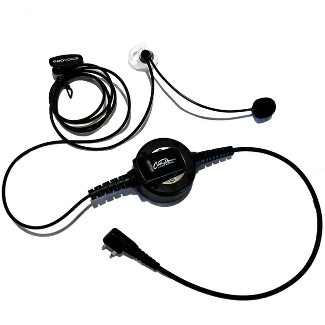 Pro Voice shirt clip and silicone generic fit earpieces (right and left).